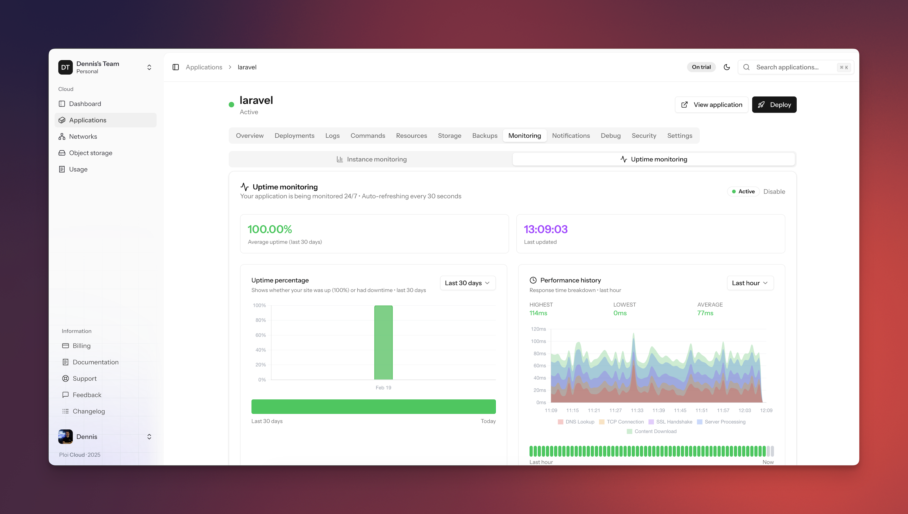Uptime monitoring is available today for all Ploi Cloud applications. Head to the monitoring tab of any deployed application and enable it with a single click.